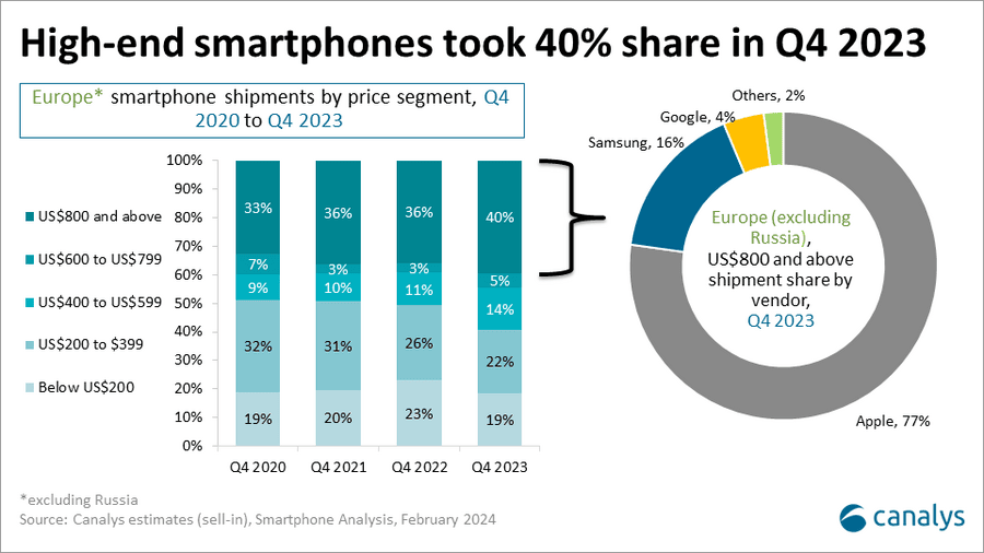 Также отмечено, что смартфоны премиум-класса получили рекордную долю европейского рынка в 4 квартале 2023 года. Почти 40% поставок смартфонов имели стоимость $800 и выше.