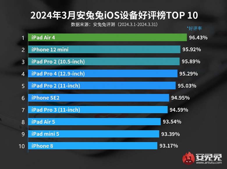 В апрельском рейтинге второе место занял iPad 12 mini, получивший 95.92% положительных отзывов, а третье место занял iPad Pro 2 с экраном диагональю 10.5 дюйма, который получил 95.89% положительных отзывов. Четвертое место занял 12.9-дюймовый iPad Pro 4, а пятое — 11-дюймовый iPad Pro 2.