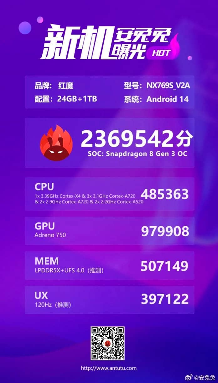 На сайте бенчмарка устройство значится под названием Nubia NX769S_V2A. AnTuTu подтверждает наличие у Red Magic 9S Pro+ однокристальной системы Snapdragon 8 Gen 3, причем речь идет о ее разогнанной модификации Leading Version.
