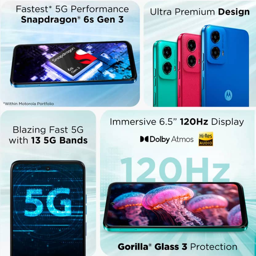 Moto G45 5G предлагает кожаную отделку, 6.5-дюймовый IPS LCD-дисплей с разрешением HD+, частотой обновления 120 Гц, пиковой яркостью 500 нит, соотношением сторон 20:9 и защитным стеклом Corning Gorilla Glass 3.