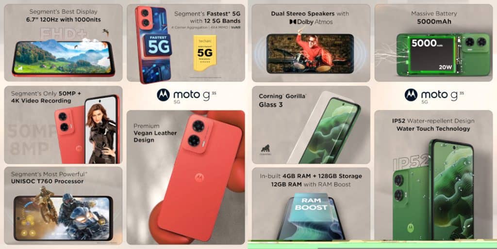 Модель Moto G35 получила заднюю панель из веганской кожи, которая придает смартфону премиальный вид, обычно присущий более дорогим телефонам. На передней панели расположен 6.7-дюймовый дисплей с частотой обновления 120 Гц, частотой отклика на касания 240 Гц, разрешением FHD+ и защитой Gorilla Glass 3.