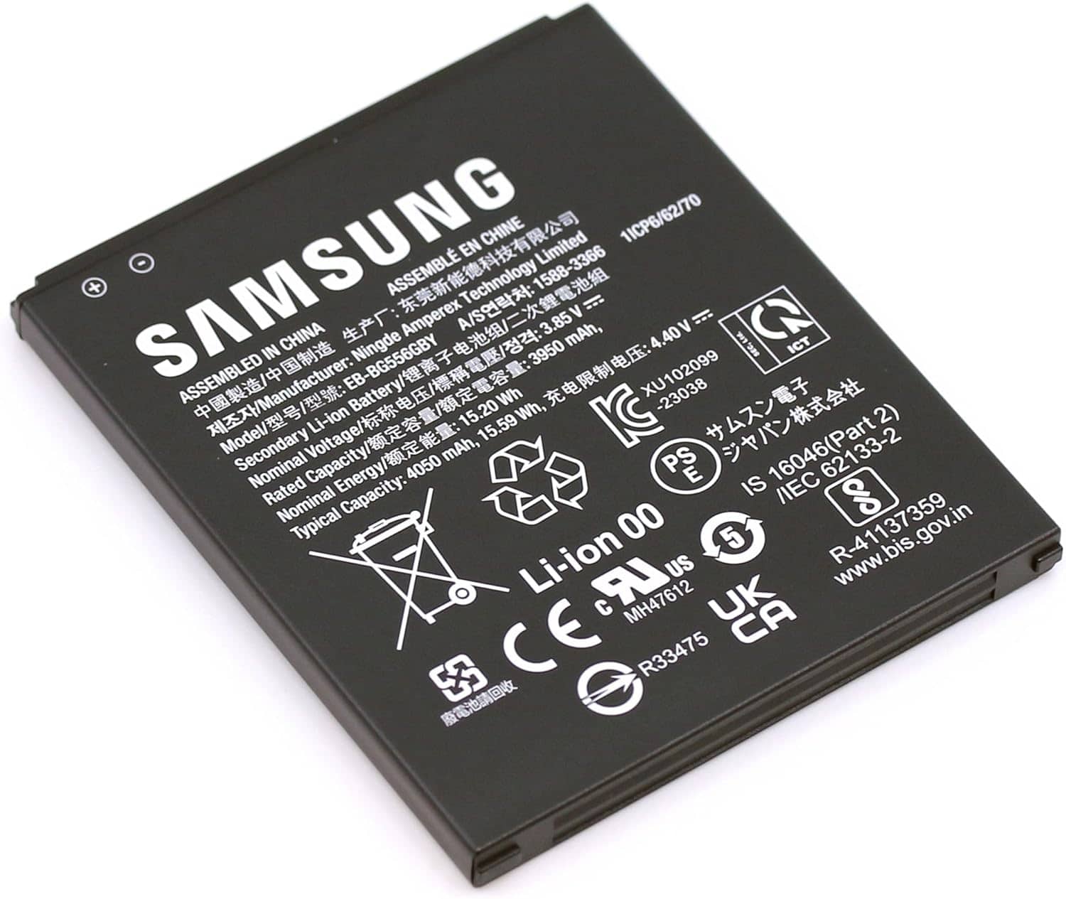 Аккумулятор с кодом EB-BG766GBY имеет номинальную емкость 4265 мАч и типичную емкость 4350 мАч, что эквивалентно 16.88 Вт·ч. Для сравнения, у Galaxy XCover7 была батарея меньшего размера — 4050 мАч (типичная емкость 15.59 Вт·ч). Батарея изготовлена компанией Amperex Technology Limited (ATL).