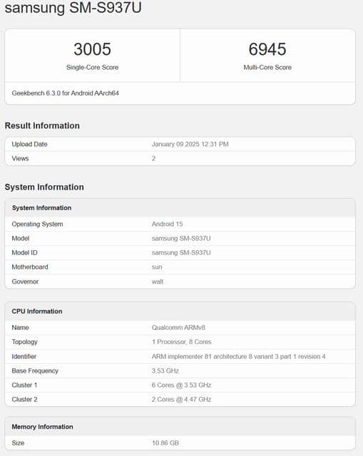 Устройство протестировано под номером модели SM-S937U. Согласно бенчмарку, смартфон оснащается процессором Qualcomm Snapdragon 8 Elite for Galaxy, 12 ГБ оперативной памяти, управляется операционной системой Android 15 с интерфейсом One UI 7.0.