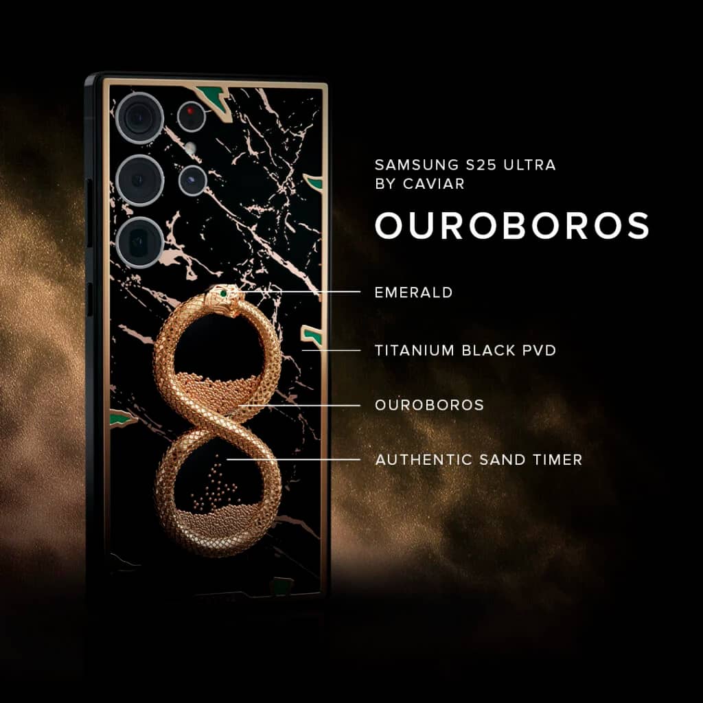 В дизайне Samsung Galaxy S25 Ultra Ouroboros используется трехмерное изображение уробороса, выполненного из чистого золота 999-й пробы, обвивающего функциональные песочные часы, встроенные в корпус. Песочные часы наполнены золотыми частицами, которые плавно перемещаются, символизируя течение времени и вечное обновление. Модель также украшена титановыми панелями с черным PVD-покрытием и золотыми гравировками.