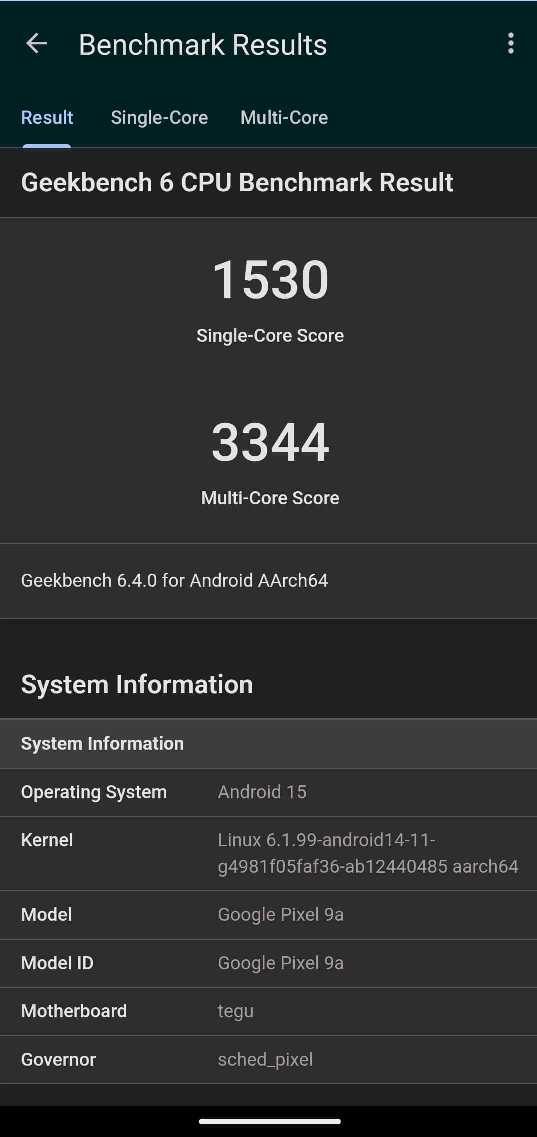 Согласно утечкам от инсайдера Сахила Кароула, Pixel 9a оснащен чипом Tensor G4. В одноядерном тесте Geekbench 6 он набрал 1530 баллов, а в многоядерном — 3344 балла.