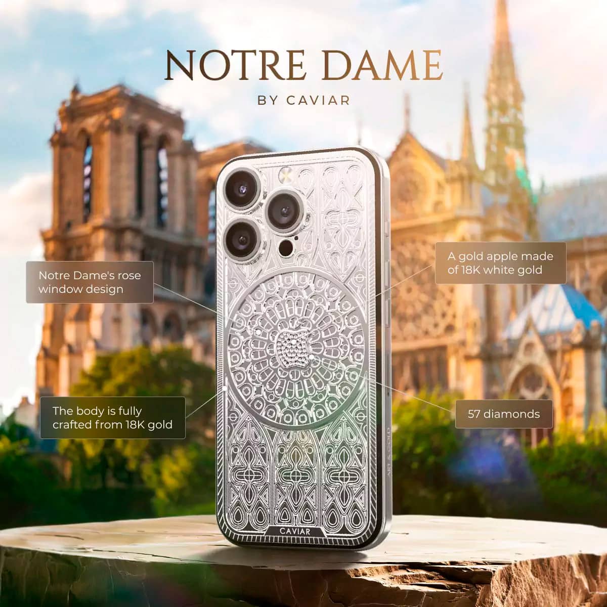 Задняя панель смартфона украшена трехмерным узором в готическом стиле, в центре которого расположен витражный элемент, повторяющий искусство легендарных окон Нотр-Дама. Дополняет оформление вручную изготовленный логотип Apple из 18-каратного белого золота, инкрустированный 59 бриллиантами разного размера, придающими устройству еще больше блеска. Вокруг корпуса расположен прочный каркас из того же белого золота, создающий ощущение монументальной архитектуры.