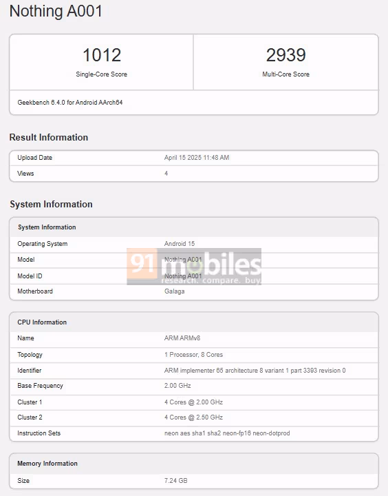 Согласно информации от 91Mobiles, CMF Phone 2 Pro был замечен в базе данных GeekBench. Он получил номер модели Nothing A0001 и будет поставляться с операционной системой Android 15, основанной на фирменной оболочке Nothing OS.