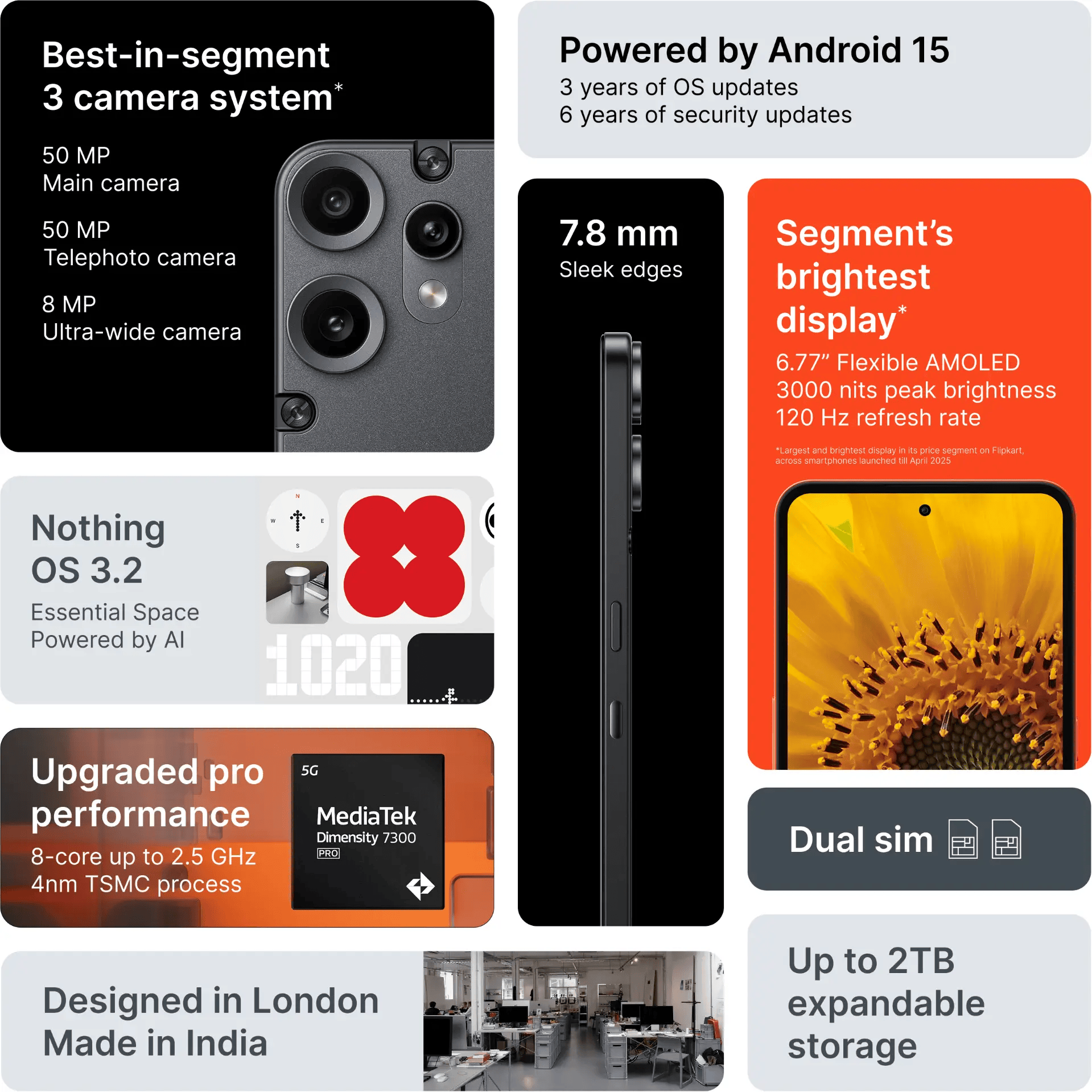 Степень защиты от воды и пыли также улучшена — теперь это IP54 вместо IP52 у предшественника. Толщина корпуса составляет 7.8 мм, вес — 185 г, что делает новинку тоньше и легче первой модели (8.2 мм и 197 г соответственно), при этом емкость аккумулятора осталась прежней — 5000 мАч, который поддерживает быструю зарядку мощностью 33 Вт и обратную зарядку на 5 Вт. На старте доступны четыре цветовых варианта: белый с песчаной текстурой, черный и светло-зеленый с матовым стеклянным покрытием, оранжевый с металлическим блеском.