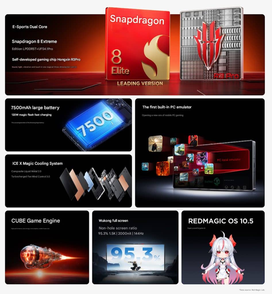 Система охлаждения Composite Liquid Metal Cooling 2.0 включает центробежный вентилятор Hot Wheels с частотой вращения до 23 000 об/мин, испарительную камеру 3D Ice-Step площадью 12 000 мм² и теплопроводящую медную фольгу размером 5200 мм². Это также первые смартфоны RedMagic с предустановленным эмулятором ПК, обеспечивающим совместимость с рядом игр на платформе Steam.