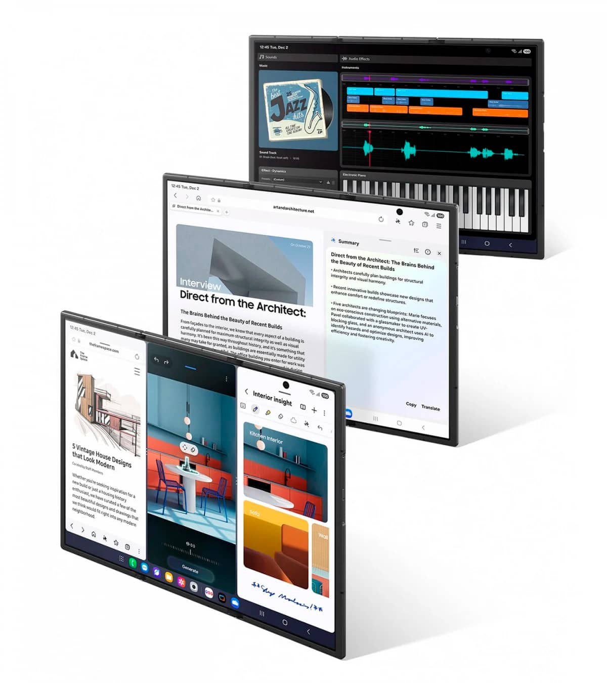 Устройство работает на One UI 8, созданной на базе Android 16. Большой внутренний экран дает простор для продвинутой многозадачности: одновременно можно запускать до трех полноформатных приложений в портретном режиме. Galaxy Z TriFold стал первым смартфоном Samsung со встроенным режимом Samsung DeX, который включает настольный интерфейс прямо из панели быстрых настроек. При подключении мыши и клавиатуры смартфон превращается в полноценную мобильную рабочую станцию.