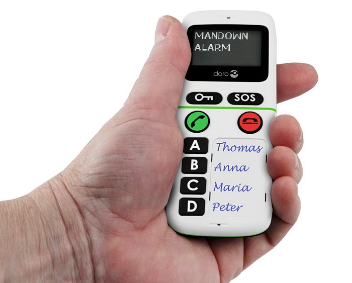 Телефон Doro HandlePlus 334 GSM обладает всего восемью аппаратными кнопками. Это клавиши вызова и сброса, SOS, блокировка, а также четыре кнопки, за каждой из которых закреплен один номер телефона. Для удобства имена абонентов можно вручную записать прямо на корпусе этого устройства.