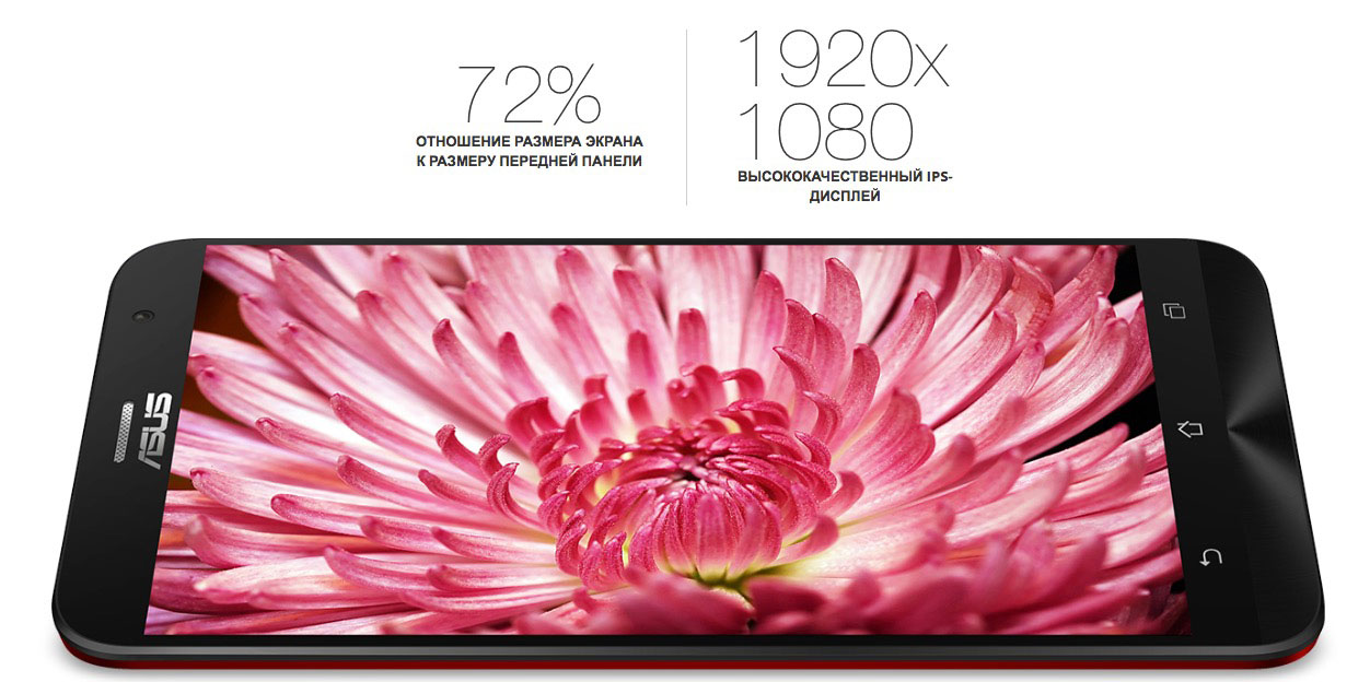 Смартфон ASUS ZenFone 2 оснащается ярким 5.5-дюймовым IPS-дисплеем с разрешением 1920 х 1080 пикселей, который занимает 72% передней панели. Толщина граней гаджета составляет 3.9 мм.