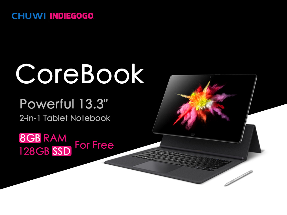 На стендах производителя однозначно окажется планшет CoreBook. В данный момент он собирает средства на Indiegogo, кампания заканчивается через 11 дней. Если на развитие устройства будет вложено еще $50 000, то вместо eMMC планшет получит 128 ГБ SSD-памяти, которая гораздо быстрее обрабатывает данные.