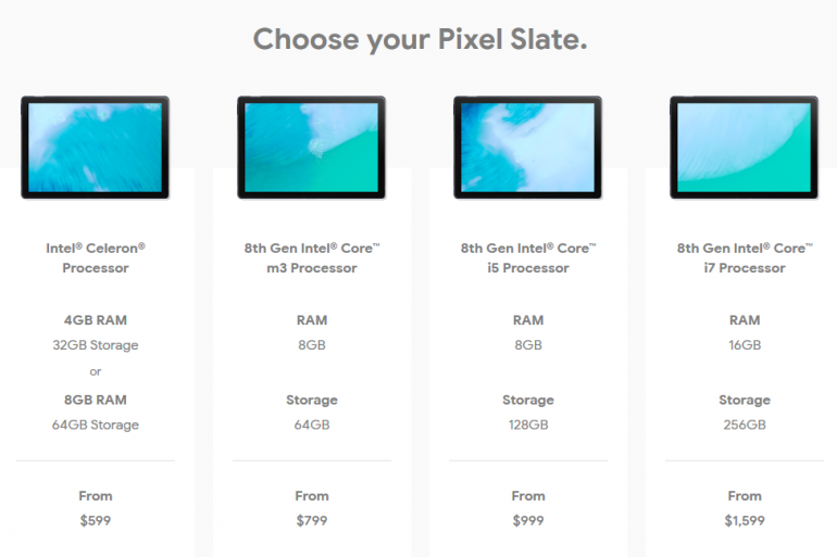 Google Pixel Slate поставляется в четырех вариантах. Базовая модель имеет процессор Intel Celeron, который оснащен 4 ГБ ОЗУ и 32 ГБ SSD-накопителя. Его стоимость составляет $599. Существуют и другие варианты: Intel Core m3, Core i5 и Core i7. Самая топовая конфигурация стоит $1599 и включает процессор Core i7, 16 ГБ оперативной памяти и 256 ГБ SSD-накопителя.