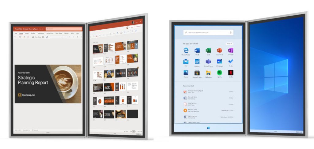 Пока что Surface Neo является прототипом. Он получил два 9-дюймовых экрана, соединенных шарнирным 360-градусным механизмом. При их разворачивании устройство превращается в полноразмерный 13-дюймовый планшет с самым тонким LCD-дисплеем в своем классе, а в сложенном виде оно выглядит как небольшой ноутбук. Толщина каждой стороны составляет 5,6 мм, поэтому в сложенном состоянии вы будете держать что-то толщиной 11,2 мм и весом 1,3 кг.