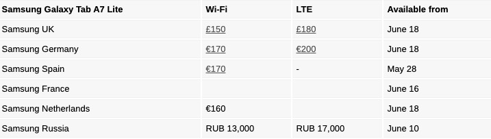 Samsung Galaxy Tab A7 Lite будет доступен для покупки в Европе на сайте Samsung.com с середины июня. Обратите внимание, что не все страны получат версию LTE. Цены вы можете увидеть ниже: