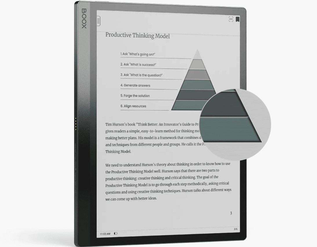 Новый планшет имеет некоторое сходство с Boox Tab Ultra. Однако он оснащен 10.3-дюймовым дисплеем Kaleido 3 E Ink, который обеспечивает более яркие цвета, чем предыдущая модель. Экран по-прежнему ограничен 4096 цветами, но с более высоким цветовым разрешением.