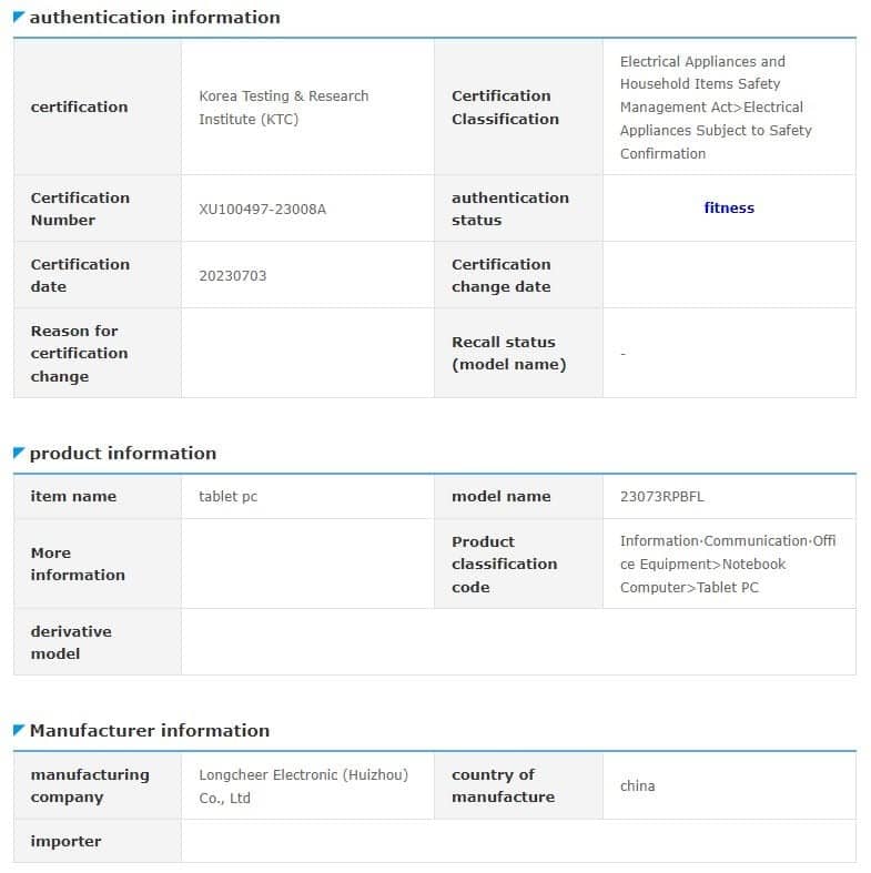 В базе данных Safety Korea устройство зарегистрировано под модельным номером 23073RPBFL. Фото устройства показывает, что его передняя камера расположена в верхней части рамки при горизонтальном положении устройства, а кнопка включения находится на левом краю.
