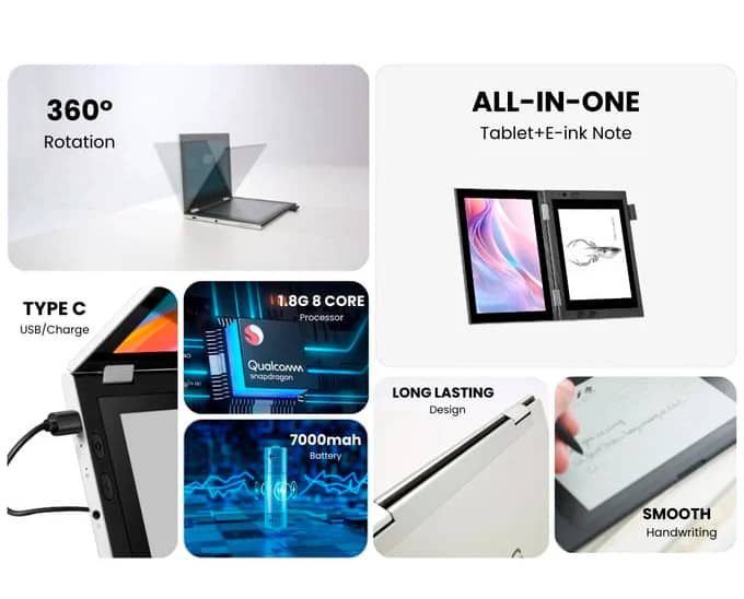 Это уникальное устройство оснащено 8.9-дюймовым IPS LCD дисплеем и 7.8-дюймовым E Ink экраном. IPS LCD экран предназначен для обычного использования планшета, в то время как E-Ink дисплей, известный своим эффектом бумаги и минимальным напряжением для глаз, идеально подходит для чтения, заметок и эскизов. Оба экрана поддерживают сенсорное управление, при этом E-Ink дисплей обеспечивает 4096 уровней чувствительности к давлению для естественного письма с помощью прилагаемого стилуса Wacom.