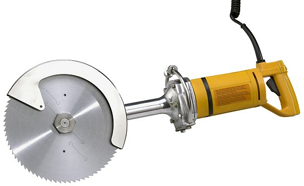2. Дисковые. Промышленные инструменты этого типа отличаются компактными размерами и более доступной ценой. Это два основных фактора, обеспечивающих их популярность. Дисковые модели оснащаются стальным корпусом, но при необходимости в продаже можно найти и пластиковые варианты. В данном случае лезвие в виде диска и приводится в действие также мотором. Такие устройства бывают ручные и стационарные. Первые более компактны, подходят для предприятий, где важна мобильность. Конструкция предусматривает наличие кожуха для защиты рук. Для предотвращения быстрого износа на кромке имеются твердосплавные напайки. Основной минус дисковых моделей состоит в слишком широком резе, из-за чего часть мяса теряется.