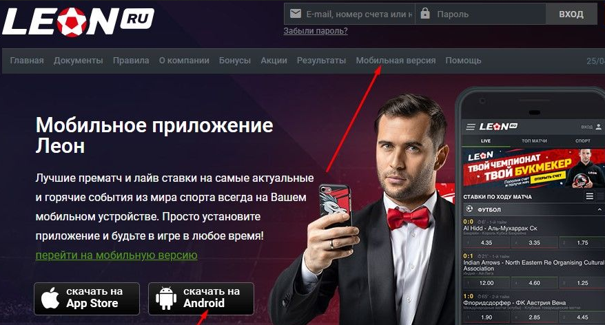 Администрация БК Леон предлагает своим клиентам очень качественное мобильное приложение, которое можно скачать бесплатно. Для того, чтобы скачать бк Leon, необходимо зайти на официальный сайт leon.ru, и пройти по ссылке «Скачать», которая находится в правом верхнем углу экрана.