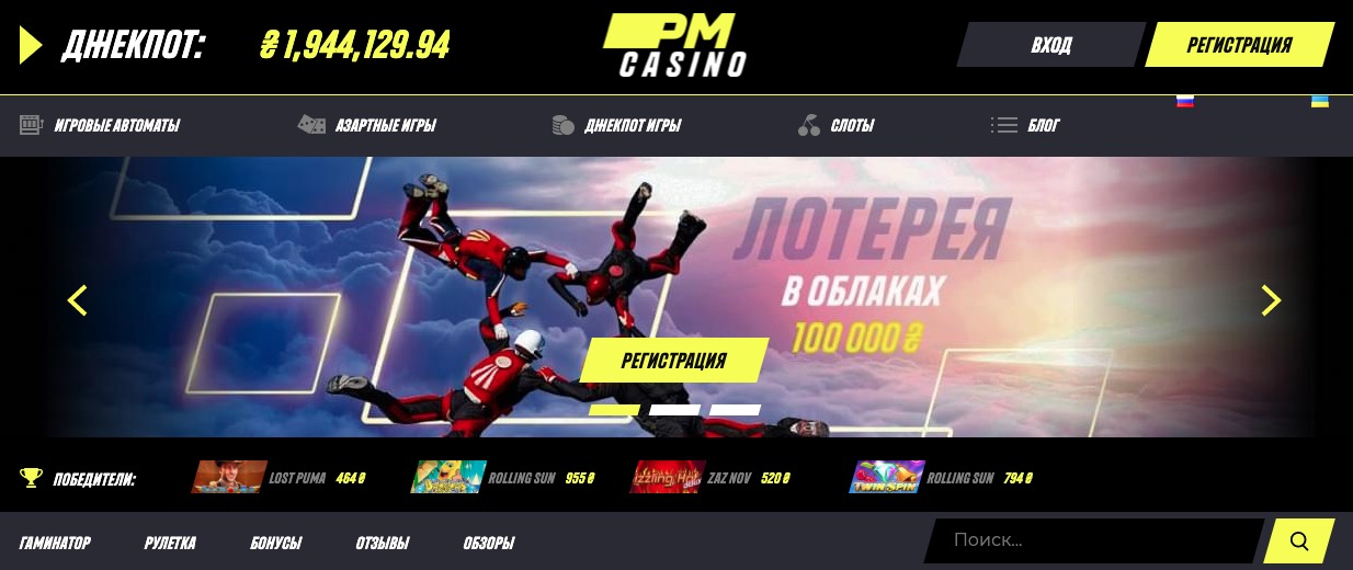 Официальный сайт PM Casino имеет яркий, нетривиальный дизайн. Цвета – черный и желтый. На главной странице размещены баннеры с опцией перелистывания. То есть пользователь сразу видит все акции, спецпредложения, условия бонусных программ. Вверху расположены навигационные элементы интерфейса.