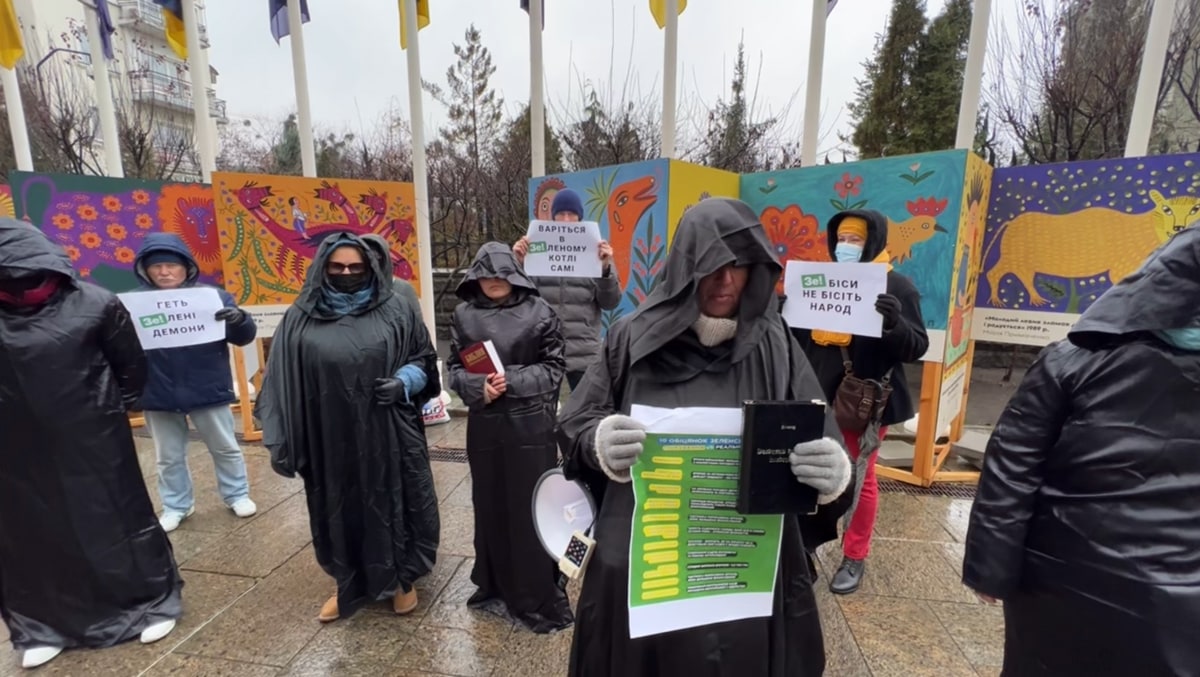Сегодня, 19 ноября, под стенами Офиса Президента собрались отчаявшееся чернокнижники, люди из «черного братства», чтобы провести «обряд экзорцизма», потому что по всем признакам, у нас завелись «зеленые черти»! Активисты предположили, что раз президент ничего не боится, может хоть это его вразумит, так как другого объяснения действиям правительства, чем одержимость – нет. Они захотели этих «зеленых чертей» оттуда выселить с помощью молитв и магии. Люди доведены до такого предела, что пытаются нечесть, которая довела нашу Украину до такого, выгнать хотя бы таким способом.