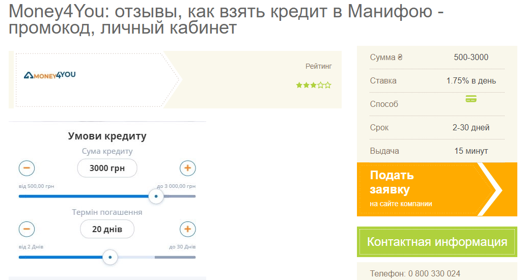 Рынок кредитных услуг в Украине достаточно конкурентен, но наибольшее количество заявок поступает в крупные, известные и давно зарекомендовавшие себя сервисы. Сайт Манифою работает с 2016 года и за это время собрал множество положительных отзывов. Его постоянные клиенты отлично знают, что сервис Money4You это: