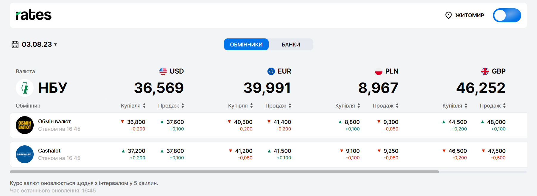 Користуватись сервісом rates.fm — легко та зручно. Достатньо вибрати місто "Житомир" у розділі обмінних пунктів. Сайт надасть вам повний перелік найближчих обмінних пунктів разом із зазначеними адресами та графіками роботи.