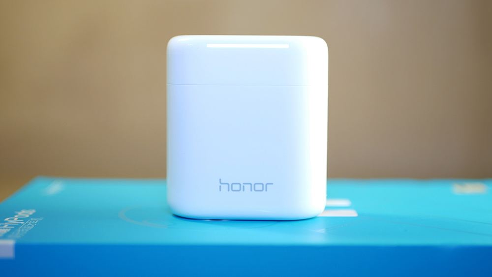 На лицевой части кейса есть логотип Honor и индикатор зарядки, состоящий из 4 светодиодов. В нижней части находится разъем USB Type-C для зарядки, а с тыла функциональная кнопка, при помощи которой происходит первоначальная синхронизация со смартфоном. Также при нажатии на нее можно увидеть уровень заряда кейса.