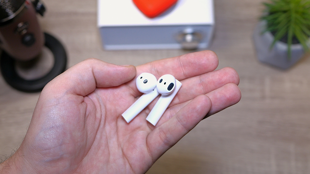 По сравнению с первой версией, наушники стали очень похожи на AirPods от Apple. Во-первых, они теперь не внутриканальные, именно поэтому в комплекте нет сменных амбушюр. Во-вторых, они имеют цельный корпус с округлым звуководом.