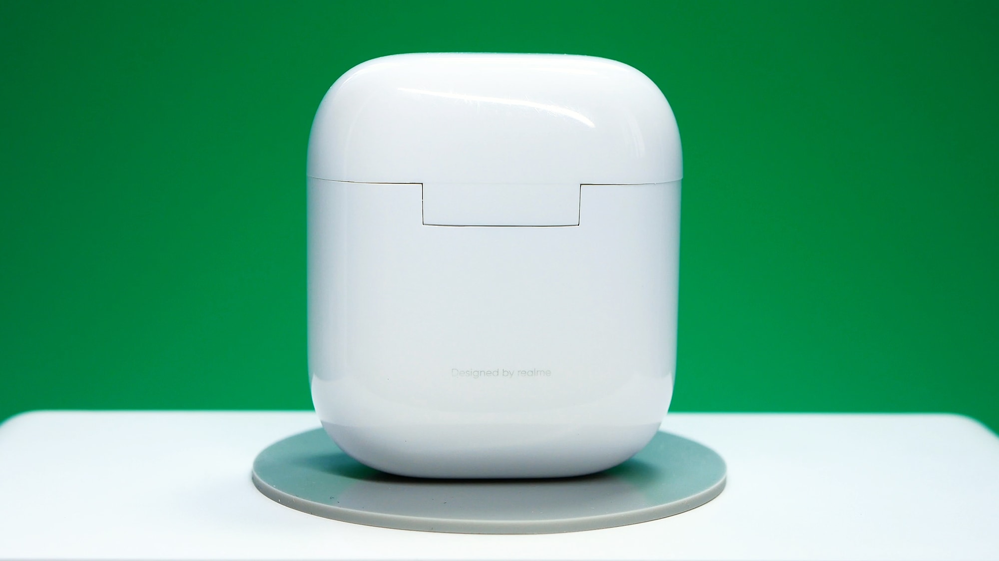 Ближе к крышке есть не очень заметный световой индикатор. На нижней части кейса разместился порт USB Type-C для зарядки, что редкость для бюджетных беспроводных наушников. На обратной стороне корпуса заметна надпись «Designed by realme».
