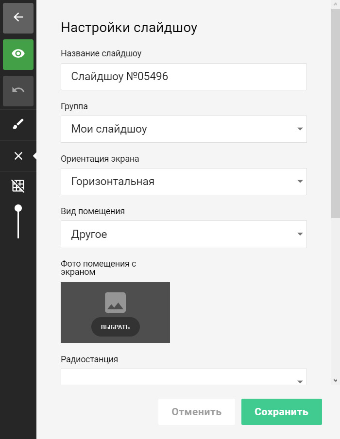 Далее жмем «Создать слайдшоу» и попадаем на страницу с настройками вашего будущего слайда. В этом окне пользователь может выбрать название для слайда, отнести его к той или иной группе, определиться с ориентацией экрана (вертикальная или горизонтальная), выбрать вид помещения (квартира, торговая точка/магазин, подъезд дома, гостиница, общепит, бизнес-центр/офис, медицинское учреждение, образовательное учреждение, государственное учреждение или другой вариант), выбрать фото, которое будет обозначать слайд, определиться с радиостанцией, если таковая будет использоваться, настроить ее громкость, а также указать адрес размещения. Когда все поля заполнены, кликаем «Создать».