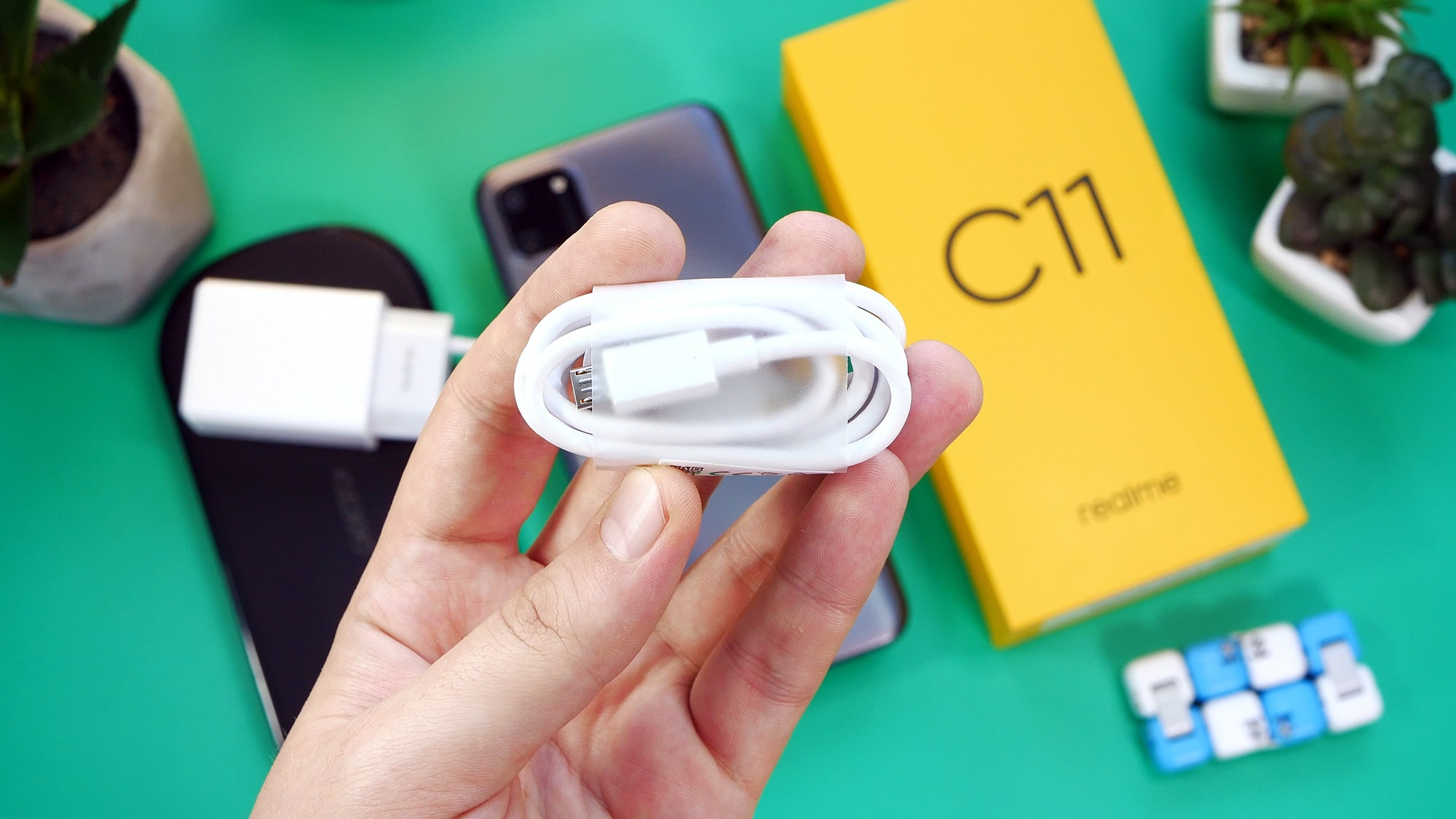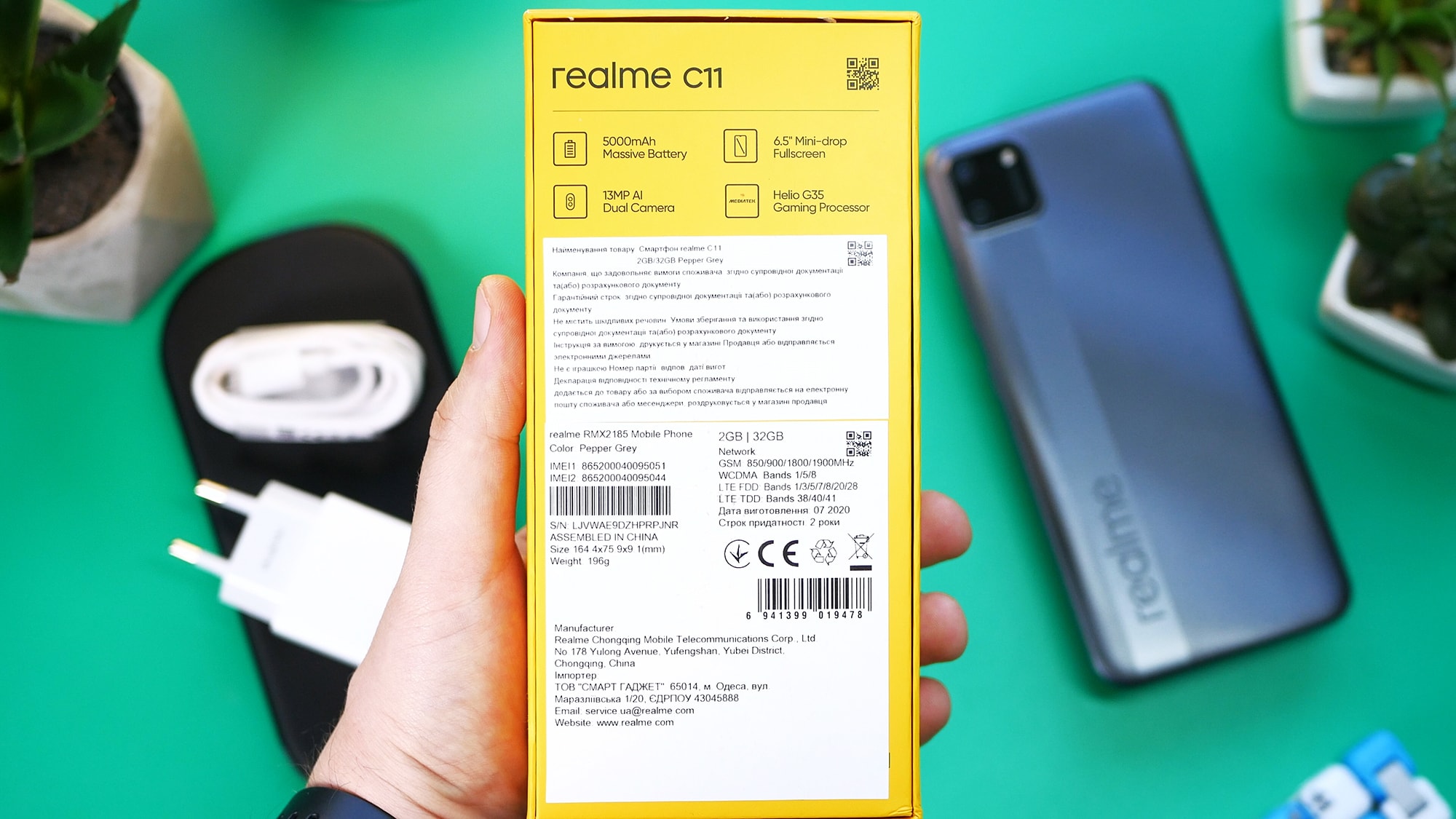 Realme C11, как и все смартфоны компании, поставляется в картонной коробке желтого цвета, в которой находится само устройство, документация, зарядный блок мощностью 10 Вт, кабель для зарядки USB/MicroUSB и скрепка для изъятия лотка SIM-карт. На экран с завода поклеена защитная пленка. Защитного чехла в комплекте нет.