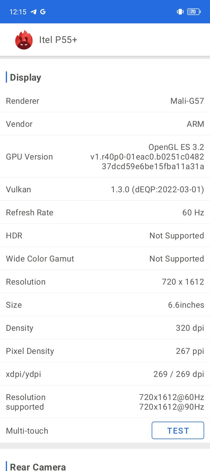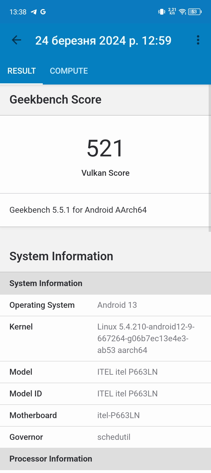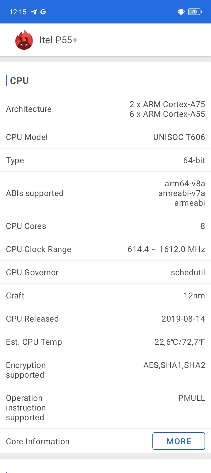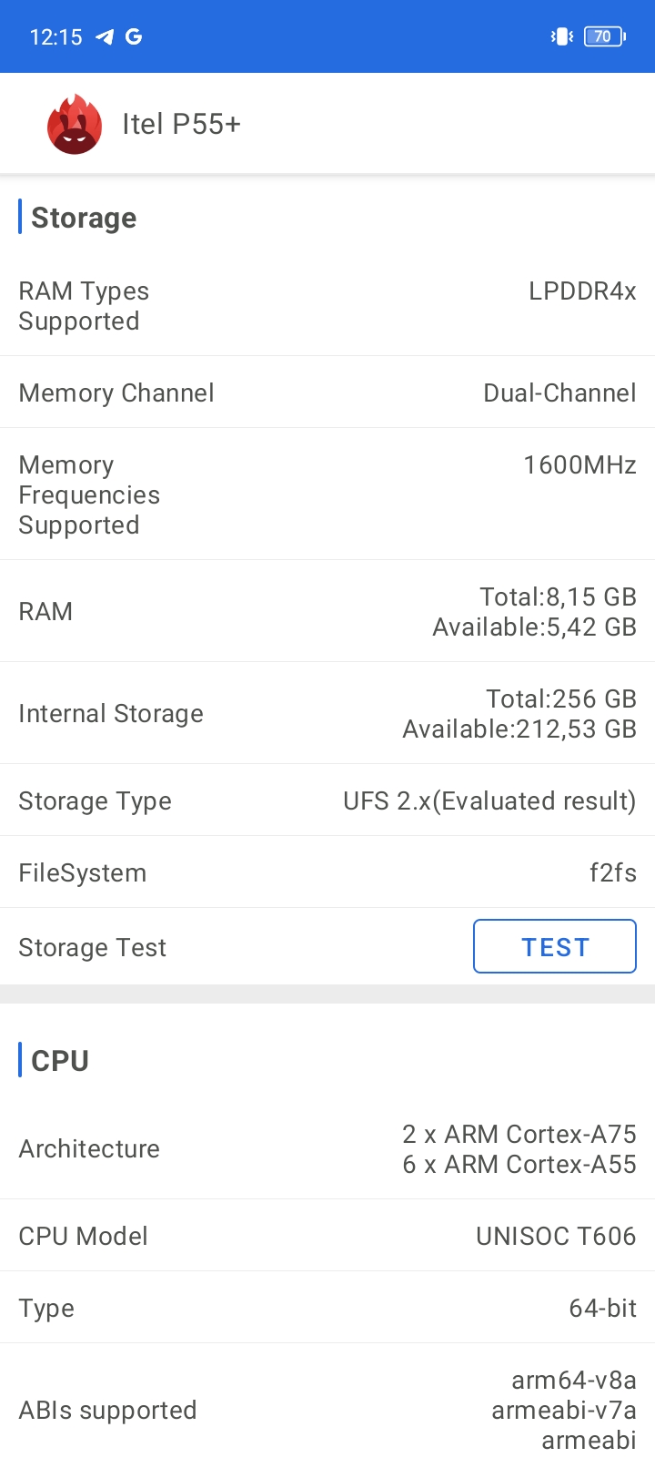 В основе itel P55+ лежит 12-нм 8-ядерная однокристальная система Unisoc Tiger T606. Она включает 2 ядра Cortex-A75 и 6 ядер Cortex-A55 с тактовой частотой 1.6 ГГц, а также графику ARM Mali-G57 MP1.