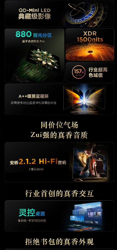 Яркость дисплея каждого телевизора составляет 1500 нит, а коэффициент контрастности равен 15 000 000:1. Охват цветового диапазона BT.709 составляет 157%. Кроме того, производителем была заявлена сертификация IMAX Enhanced, поддержка HDR10, HDR10+, Dolby Vision и AMD FreeSync Premium Pro.