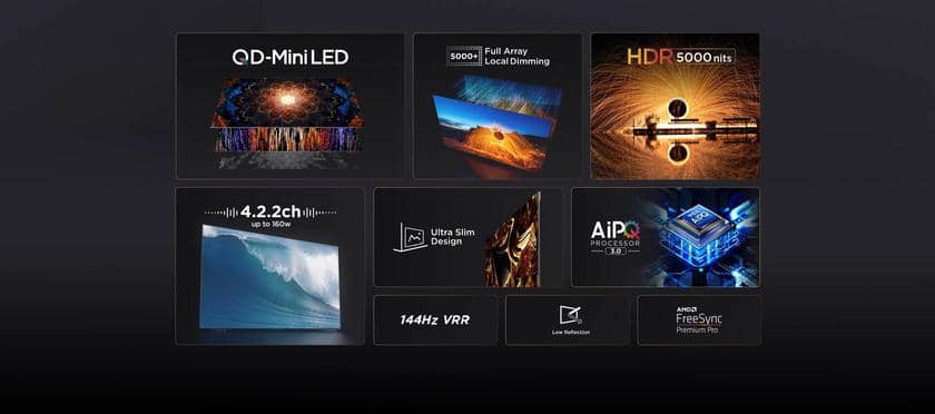 В устройствах используется искусственный интеллект для оптимизации цветопередачи, контрастности и четкости изображения. Телевизоры используют панели QD-Mini LED формата 4K ULTRA HD с разрешением 3840 x 2160 пикселей, частотой обновления изображения 144 Гц, поддержкой технологии AMD FreeSync Premium Pro.