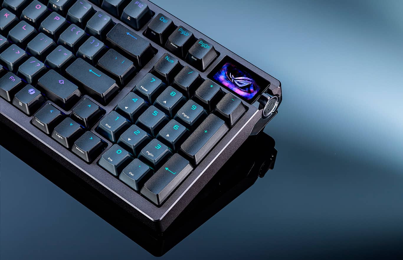 Завдяки формату 96% Asus вдалося додати повноцінний цифровий блок та кілька додаткових клавіш, не збільшуючи габарити пристрою. Підключення універсальне: клавіатура підтримує три режими — фірмовий ROG SpeedNova 8K (бездротовий із частотою опитування 8000 Гц), Bluetooth та USB-C, а також дозволяє одночасно підключати до п'яти пристроїв. Примітно, що висока частота опитування зберігається і в дротовому, і бездротовому режимі, що гарантує мінімальну затримку введення. Знайомий 1.47-дюймовий OLED-дисплей і багатофункціональне колесо керування також повернулися — за допомогою їх можна налаштовувати підсвічування, макроси та параметри спрацьовування прямо під час роботи.
