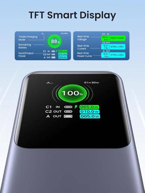 Повербанк оснащено TFT-дисплеєм, що показує статус заряджання. Повне заряджання акумулятора через USB-C займає 2 години. Ugreen стверджує, що пристрій зберігає понад 80% своєї ємності після 1000 циклів перезаряджання.