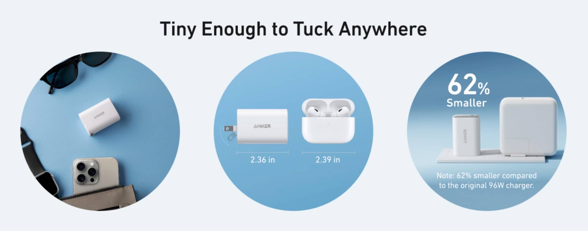 Компанія заявляє, що Anker Nano поміститься в будь-яку кишеню, оскільки її розмір зі складеним штекером всього на 17% більше зарядного кейсу AirPods Pro 2.