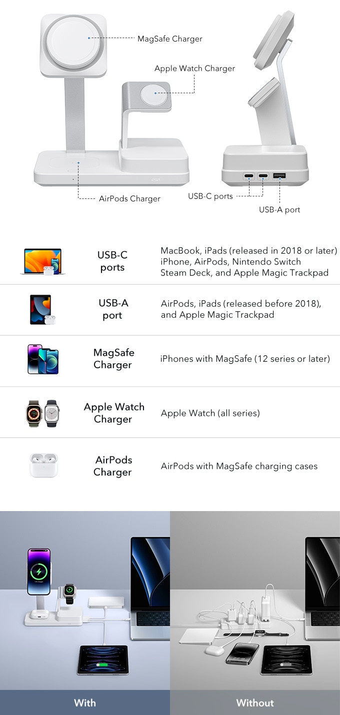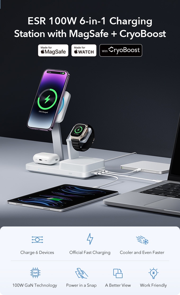 ESR 100W 6-in-1 Charging Station може похвалитися безліччю функцій, вміє одночасно заряджати три пристрої за допомогою проводів та ще три пристрої бездротовим шляхом. Особливо важливо відзначити, що пристрій має офіційну сертифікацію MagSafe, що дозволяє заряджати купертинівські гаджети.