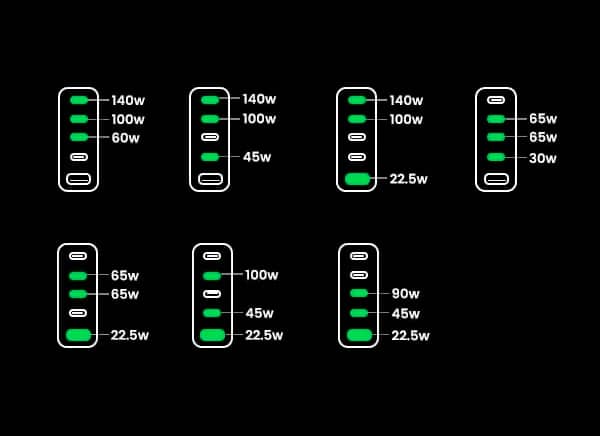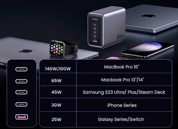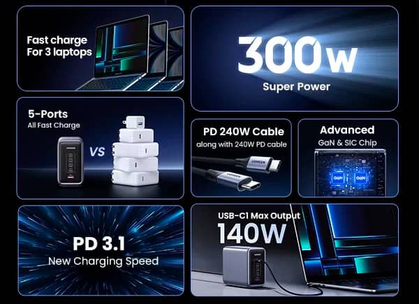 Пристрій оснастили п'ятьма роз'ємами: чотири USB-C та один USB-A. Максимальна вихідна потужність одного роз'єму становить 140 Вт — MacBook Pro 16" зарядиться до 56% за 30 хвилин.