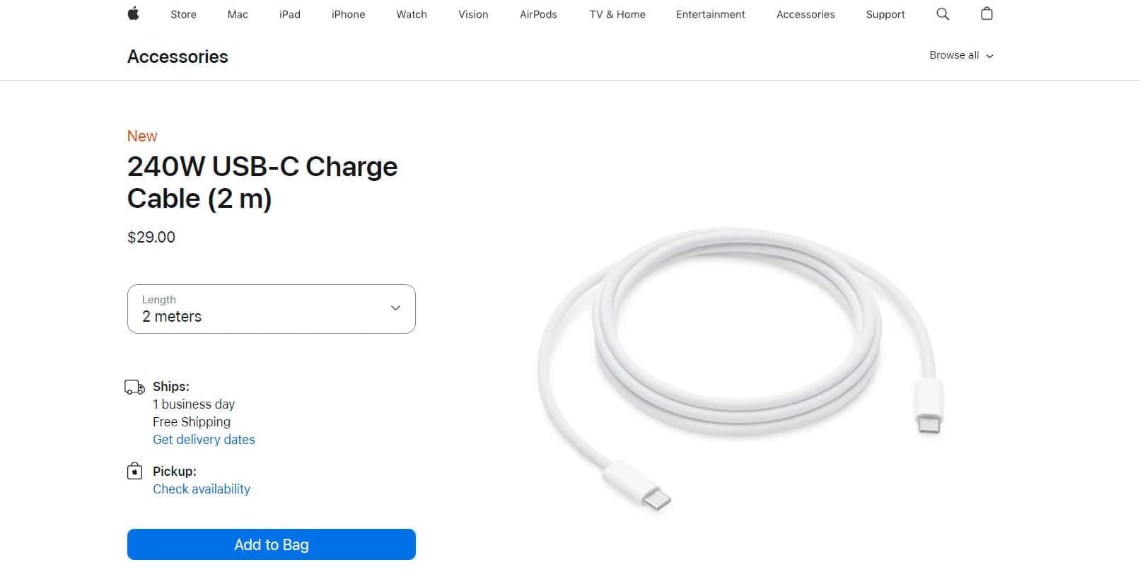 Компанія Apple додала в каталог на сайт два нові плетені кабелі. Один із них підтримує зарядку потужністю 60 Вт, а інший – 240 Вт.