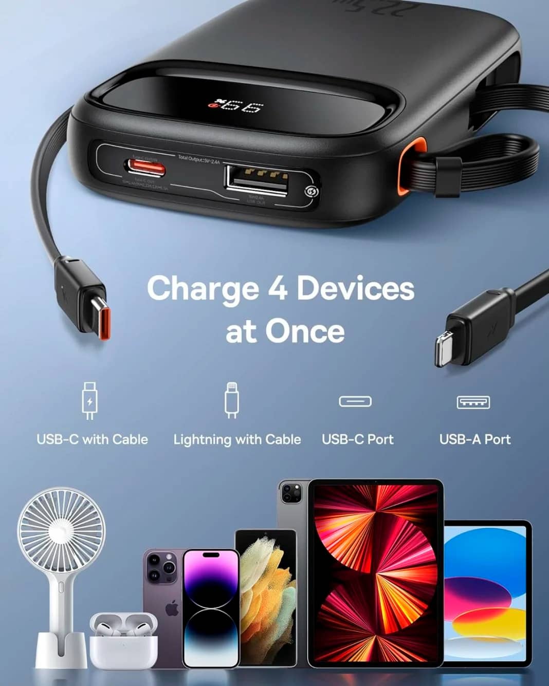 Baseus Power Bank 22.5 W комплектується вбудованими кабелями для заряджання USB-C 22.5 Вт, USB-C 20 Вт, USB-A 12 Вт та Lightning 20 Вт. Слід зазначити, що кабель USB-C не підтримує заряджання пристроїв на базі iOS.