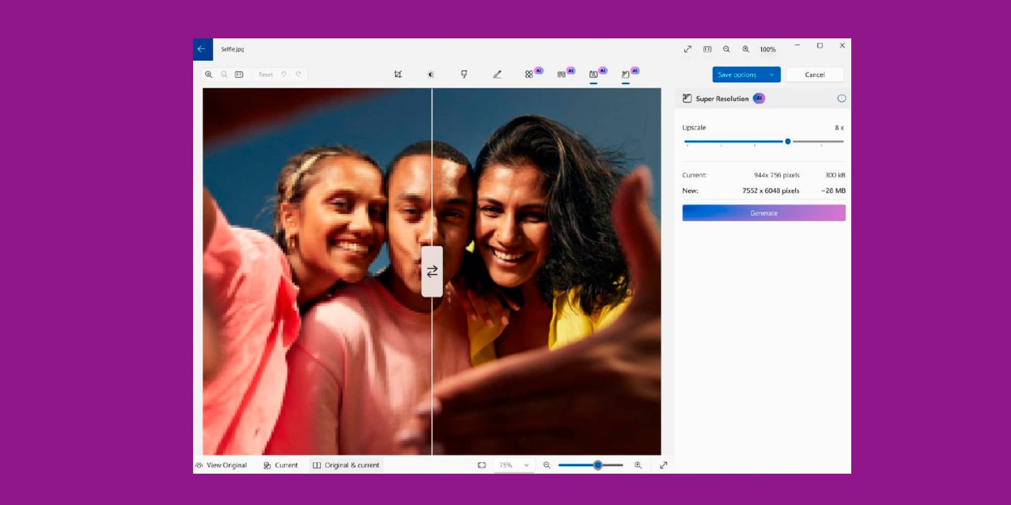 Програма «Фотографії» також отримала опцію генеративного стирання. Разом з цим у неї з'явилася функція Super-Resolution, яка за допомогою AI дозволяє збільшувати роздільну здатність розмитих зображень — до восьми разів. Це можна порівняти з можливостями апскейлера Canva і перевищує 4-кратне покращення в Adobe Lightroom. При цьому фіча Microsoft надається безкоштовно.