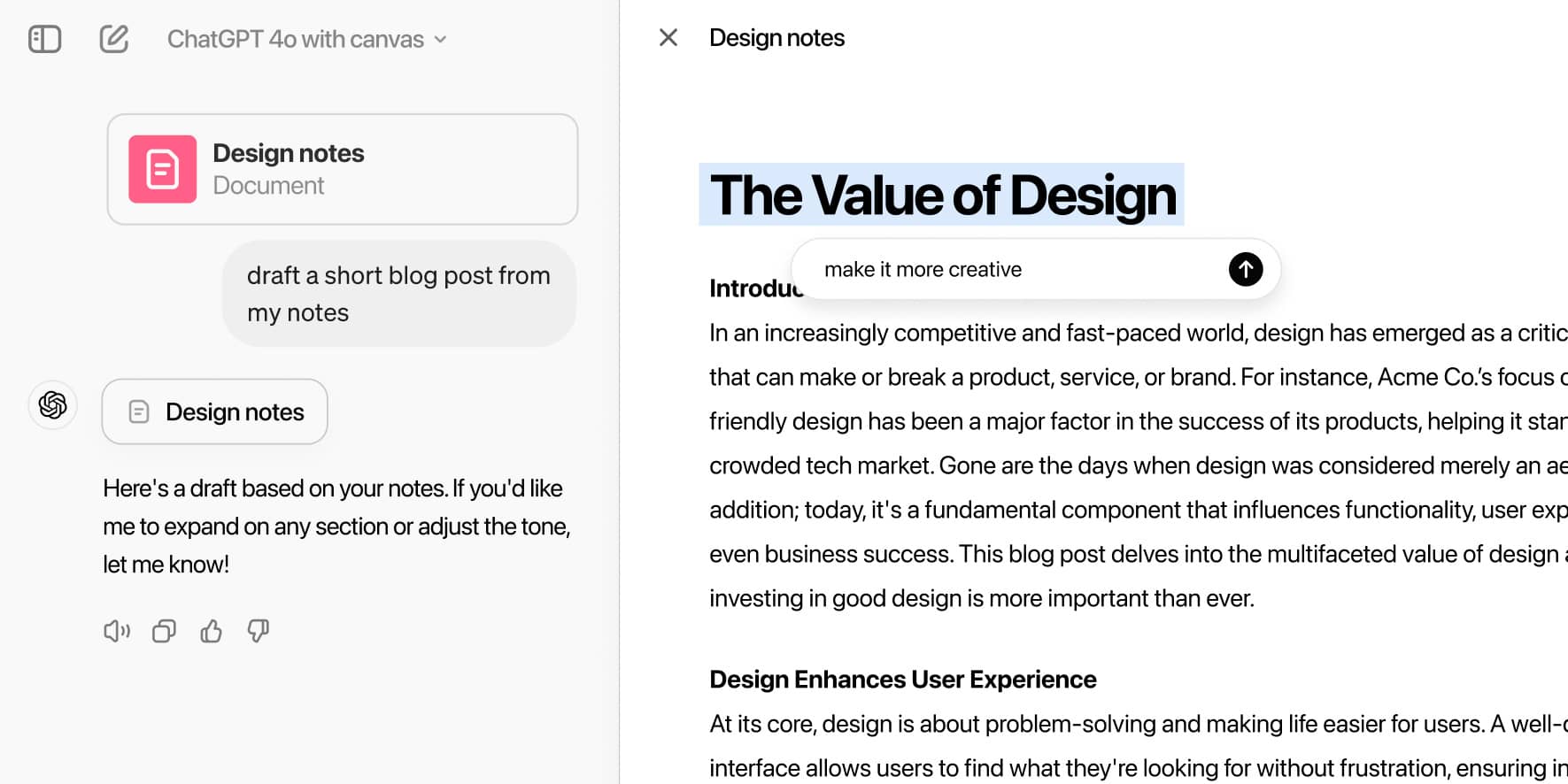 Менеджер продукту OpenAI Деніел Левін показав, як працює нова функція, на прикладі написання електронного листа. Спочатку він попросив ChatGPT згенерувати повідомлення і воно відкрилося в окремому інтерфейсі. Потім він використав спеціальний повзунок, щоб змінити довжину листа. Також Левін показав, що можна виділити будь-яку пропозицію та попросити AI внести до неї зміни — наприклад, зробити текст більш доброзичливим.