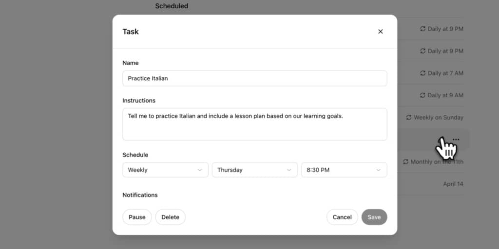 Функціональність Tasks дозволяє задавати дії та вказувати, коли їх потрібно виконати. Можна, наприклад, попросити ChatGPT щоранку надсилати погоду або нагадати про закінчення терміну дії паспорта.
