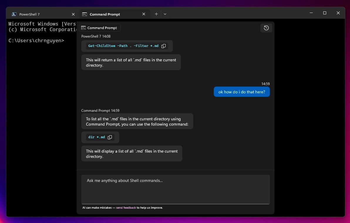У цьому прикладі користувач просить штучний інтелект показати всі файли з розширенням .md, після чого чат-бот пропонує команду «dir *.md». За словами розробників, принадність нової функції полягає в тому, що команду можна безпосередньо скопіювати в командний рядок для її подальшого виконання.