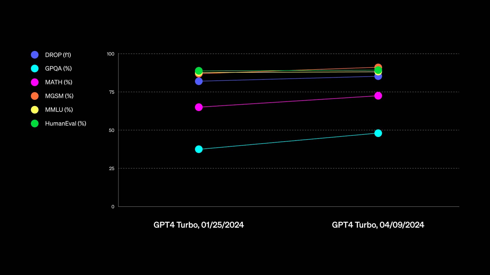 Тепер доступна покращена версія GPT-4 Turbo. У ній прокачали здібності нейромережі щодо написання текстів та програмного коду. AI-модель найкраще вирішує математичні завдання. Згідно з графіком змін, представленим OpenAI, найбільший прогрес спостерігається в математиці та експертному мисленні на рівні випускника університету.
