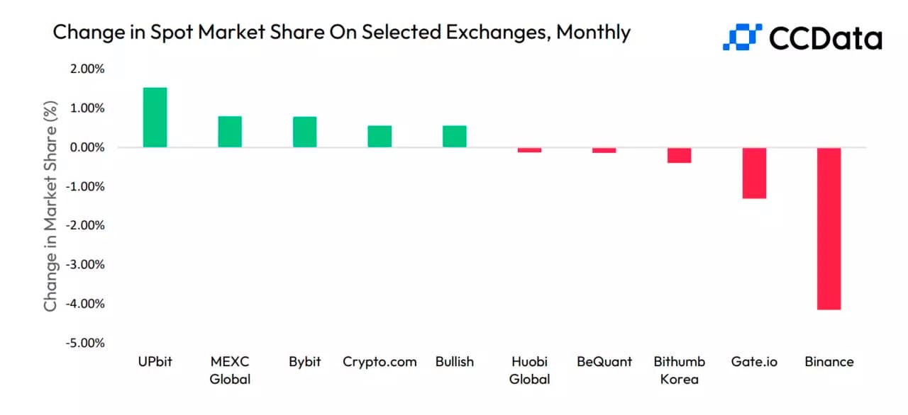 За даними аналітичного сервісу CCData, обсяг торгів на спотовому майданчику Binance знизився до жовтня 2020 року. Зараз Binance займає 34,3% загального обсягу на спотовому криптовалютному ринку. Аналітики вважають, що значне зниження обсягу торгів пов'язане, зокрема, зі скасуванням нульових комісій за торгівлю в парі BTC/TUSD.